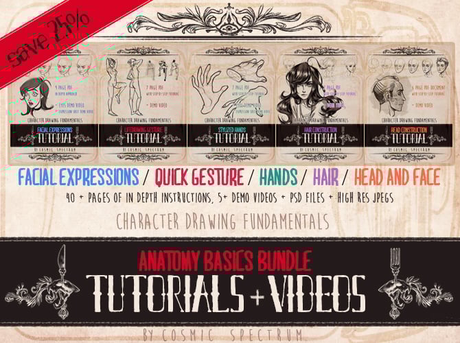This is a Bundle Combo of my previous 5 tutorials! These tutorials are aimed at beginner and intermediate artists and include tons of tips on how to approach drawing and achieve a level of skill that allows you to draw characters quickly, and without the need of references.